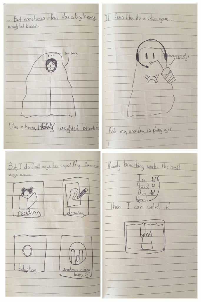 To help explain anxiety to young children (ages 5-12) the authors recommend a book by Karen Young, called Hey Warrior. I ordered it online and had it posted to my oldest granddaughter. The little Warrior character turns out to be our amygdala. Soon after reading it and learning how her amygdala operates to protect her, my granddaughter was inspired to create her own illustrated story to explain how anxiety feels to a 10 year old:
